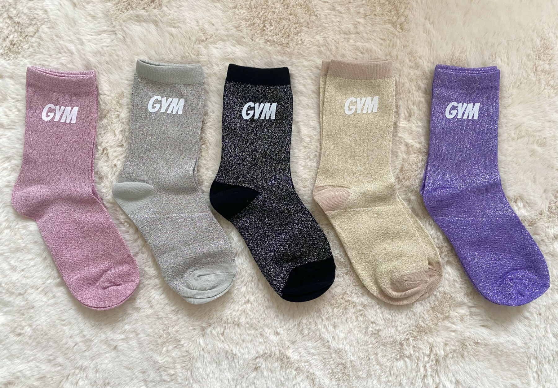 NOUVEAUTÉ : chaussettes pailletées « GYM », parce qu’être gymnaste, ça se vit jusqu’à la pointe des pieds… Elles viennent tout juste d’arriver, et elles vont clairement faire tourner les têtes dans les vestiaires. Combinant confort, fun et éclat, elles sont parfaites pour les entraînements ou simplement pour afficher fièrement sa passion au quotidien. Disponibles en 5 coloris : noir, doré, violet, rose & argent