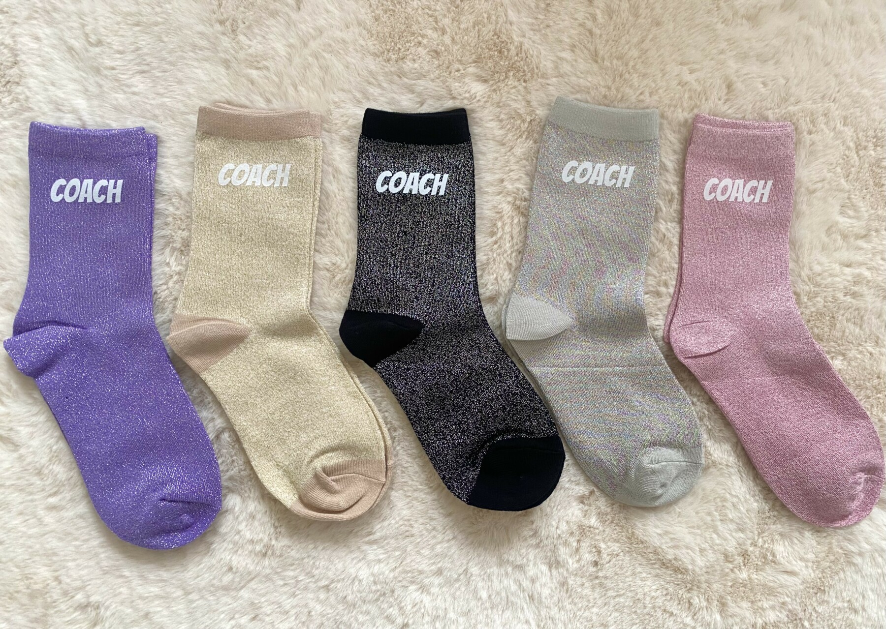 NOUVEAUTÉ : chaussettes pailletées « COACH», cadeau parfait pour remercier votre entraineur. Une idée de cadeau simple, fun et qui fait toujours plaisir. Disponibles en 5 coloris : noir, doré, violet, rose & argent